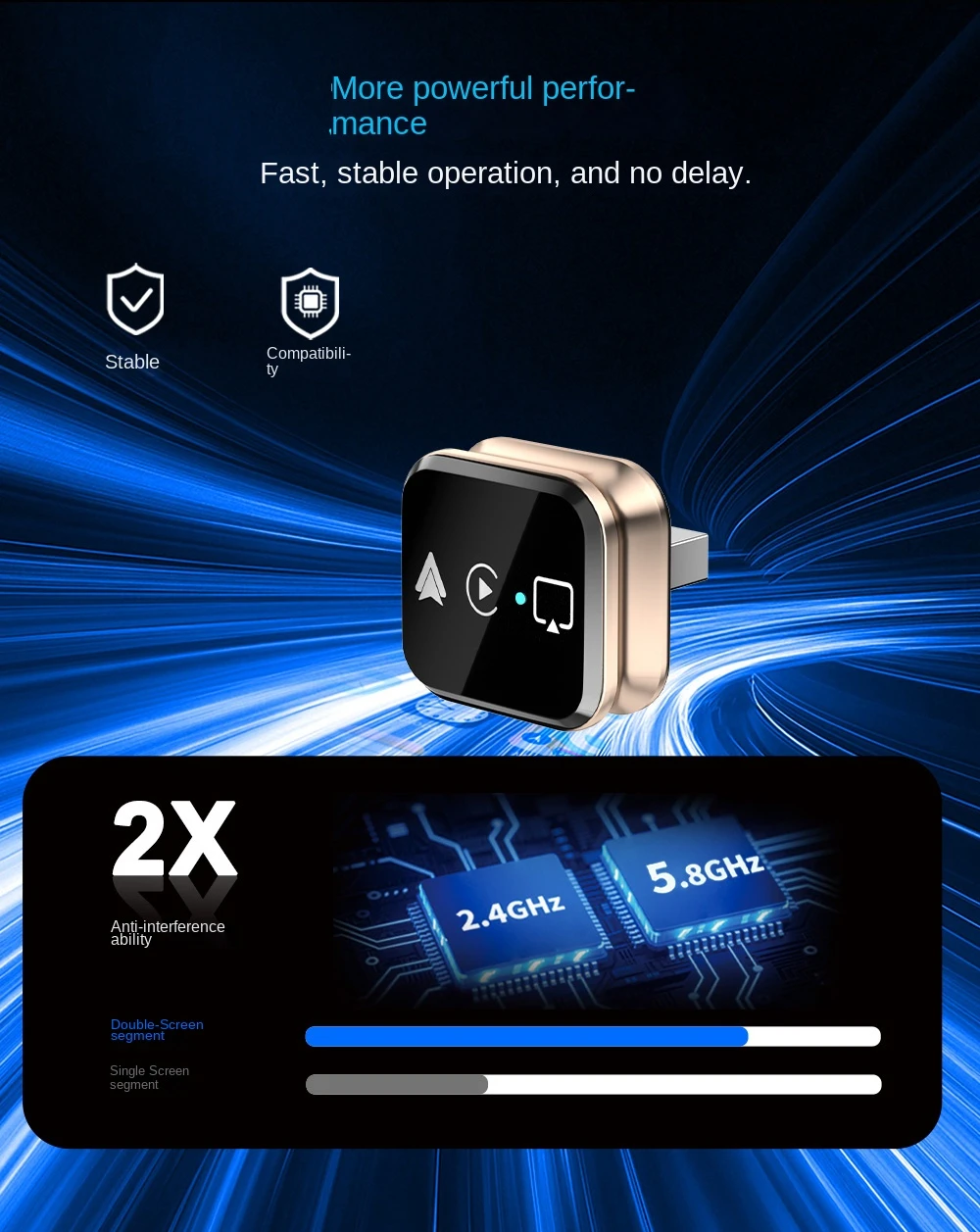 Experience ultra-responsive connectivity with advanced dual-core processing and 5.8GHz WiFi technology. Our carplay stability ensures for navigation, music and calls – even in extreme temperatures (-20°C to 70°C). The adaptive dual-band (5.8GHz) WiFi and Bluetooth 5.X automatically select the clearest channel, delivering 40% faster boot-up than standard adapters.
