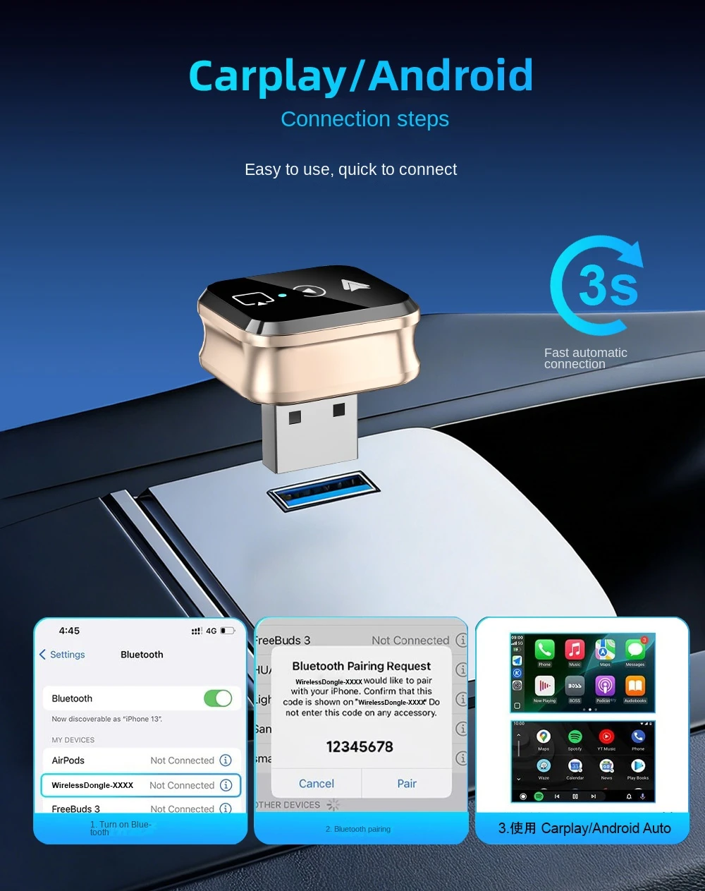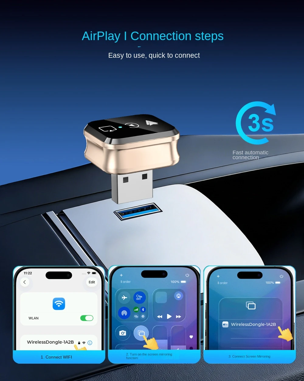 Effortlessly upgrade your wired CarPlay to wireless with true plug-and-play simplicity. No apps, downloads, or complex setup required – just connect and enjoy automatic pairing in under 3 seconds. The smart auto-reconnect feature ensures your device links instantly every time you start your car